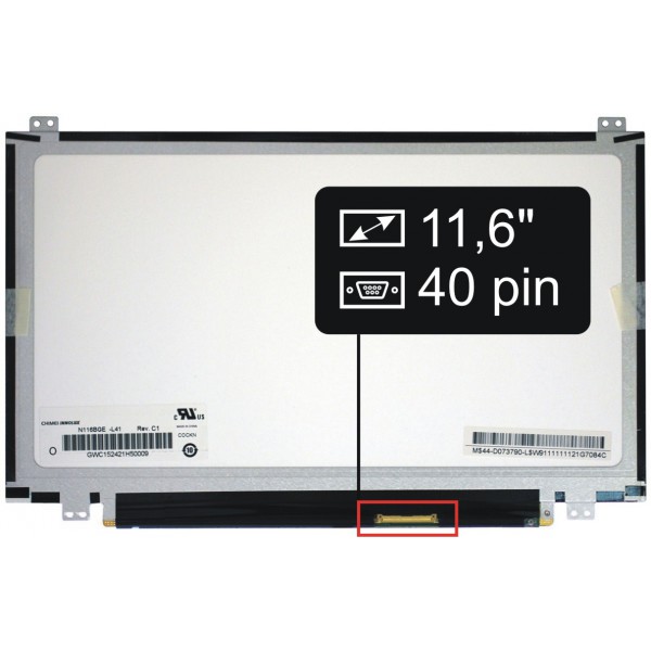 Podstawowe dane: świecąca powierzchnia, rozmiar 11,6", rozdzielność 1366x768, LED podświetlenie, 40 pinowy LED konektor znajdujący się na matrycy w prawo dole (przy spojrzeniu na tylną stronę matrycy).